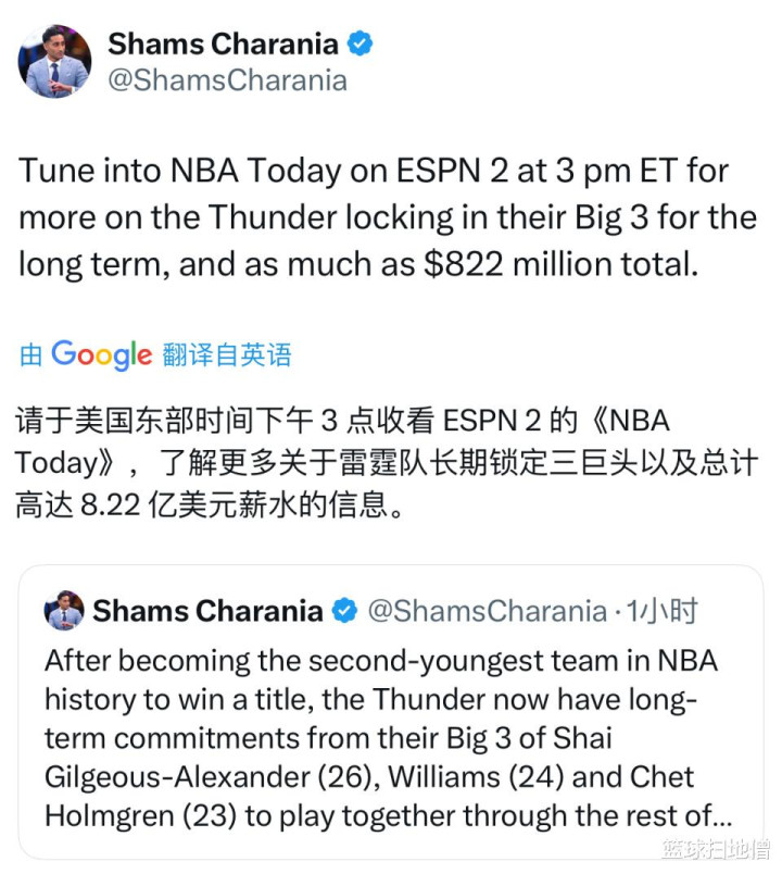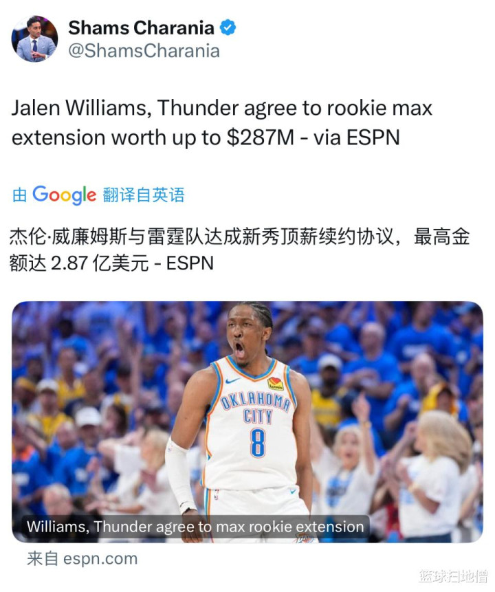 随后不久,著名记者Shams继续补充道,雷霆队已经与杰伦-威廉姆斯达成了顶薪提前续约合同,最高可达5年2.87亿美元。